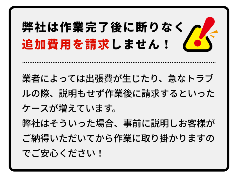 作業前に提出するお見積りと作業内容以外のものを請求することはございませんので、ご安心ください。
